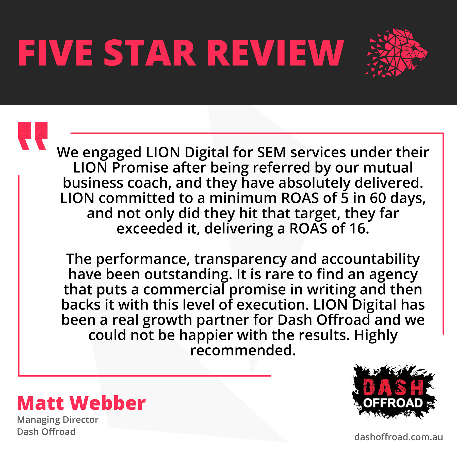 DASH OffRoad, a leading Australian 4WD accessories brand, partnered with LION Digital under the LION Promise to expand reach and accelerate growth. “LION committed to a minimum ROAS of 5 in 60 days – and not only did they hit that target, they far exceeded it. Their performance, transparency, and accountability have been outstanding,” says Matt Webber, Managing Director. Since then, campaigns have continued to scale, now reaching a 29x ROAS.